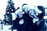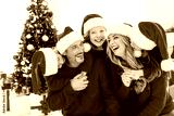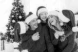 Family celebration at home parents children wear Santa hats red sweaters gathered around Christmas tree gifts warm smiles holiday lights