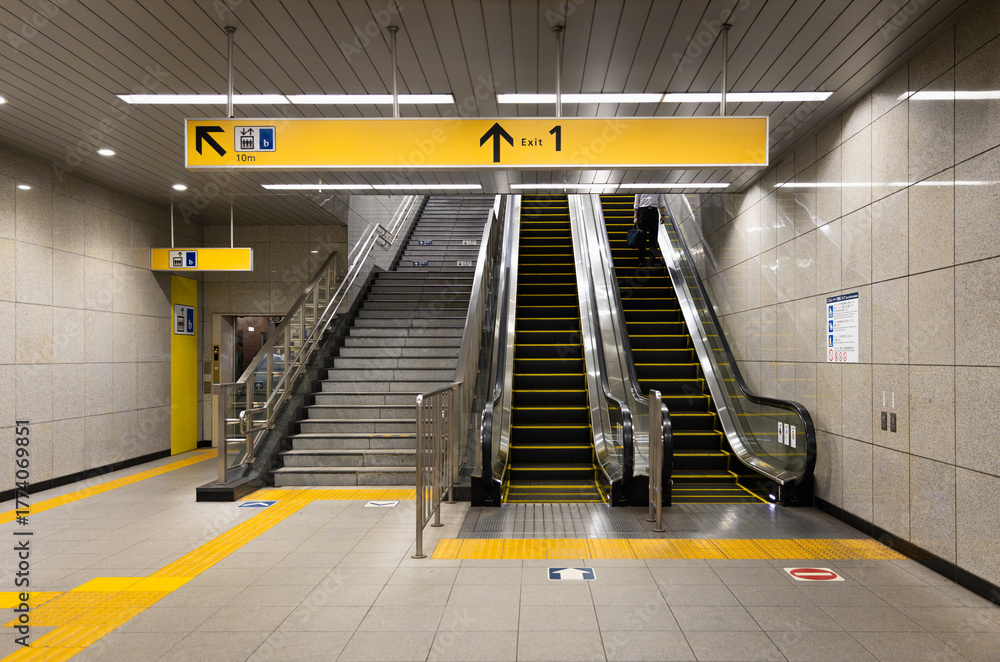 An empty subway corridor with an office worker going down the escalator to catch the train to work. Ideal as a background.