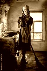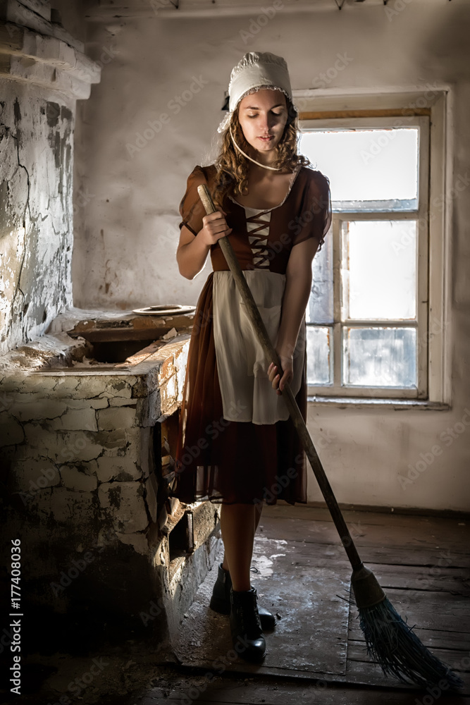 woman in a rustic dress sweeps the wooden floor in the kitchen