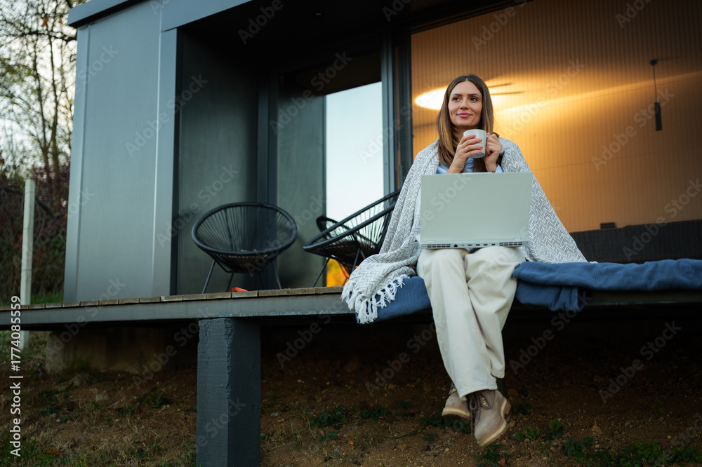 Woman sitting on a wooden terrace, wrapped in a cozy blanket, holding a steaming mug and working on a laptop, enjoying the outdoor comfort of a modern tiny house