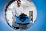 Medical professional in white coat prepares patient for CT scan inside advanced imaging machine, showcasing healthcare technology and patient care in a clinical environment