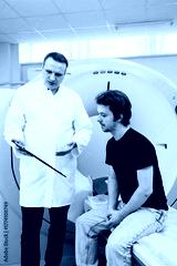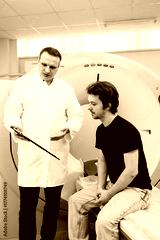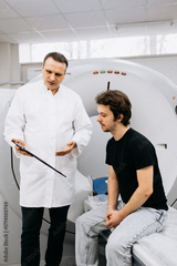 Medical professional explaining CT scan procedure to patient seated on examination table in modern healthcare facility, showcasing advanced imaging technology and patient care concept
