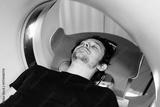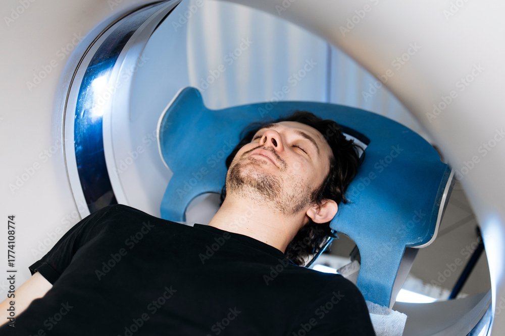 Male patient lying on examination table inside CT scanner, with blue headrest and soft lighting, illustrating advanced medical imaging technology and patient care