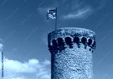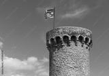 Historic round stone tower with Catalonia flag in Tossa de Mar Spain