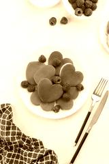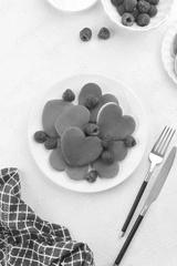 A heap of heart shaped pancakes on the white plate with raspberries on the white background