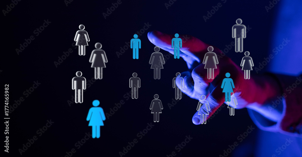 Abstract concept of online connection, social network, community, diversity, and inclusion with hand interacting with digital icons representing