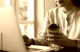 Business woman hand holding a paper cup of coffee during working on laptop computer at home office or coffee shop. taking a break, freelance at work, people lifestyle