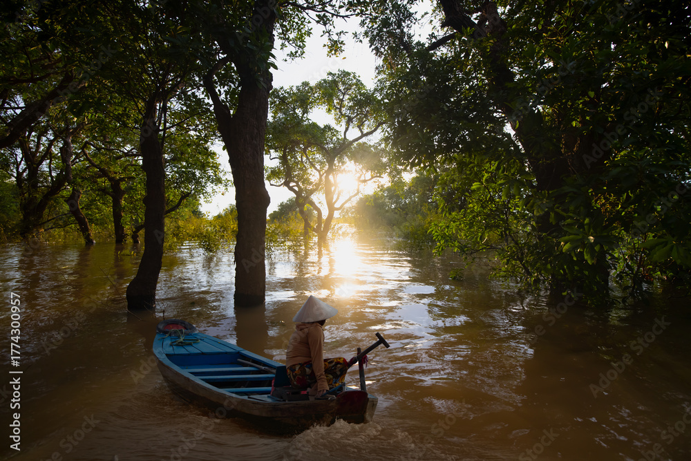 Tonle Sap lake, Siem reap Province, Cambodia. Fisherman in his boat, Floating village of Kompong Phluk, Cambodia.