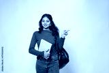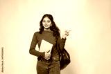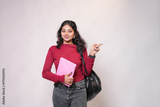 Happy indian female college student with backpack and books pointing at blank space for advertisement isolated on white background. Young asian gen z adult girl looking at camera. Admission open