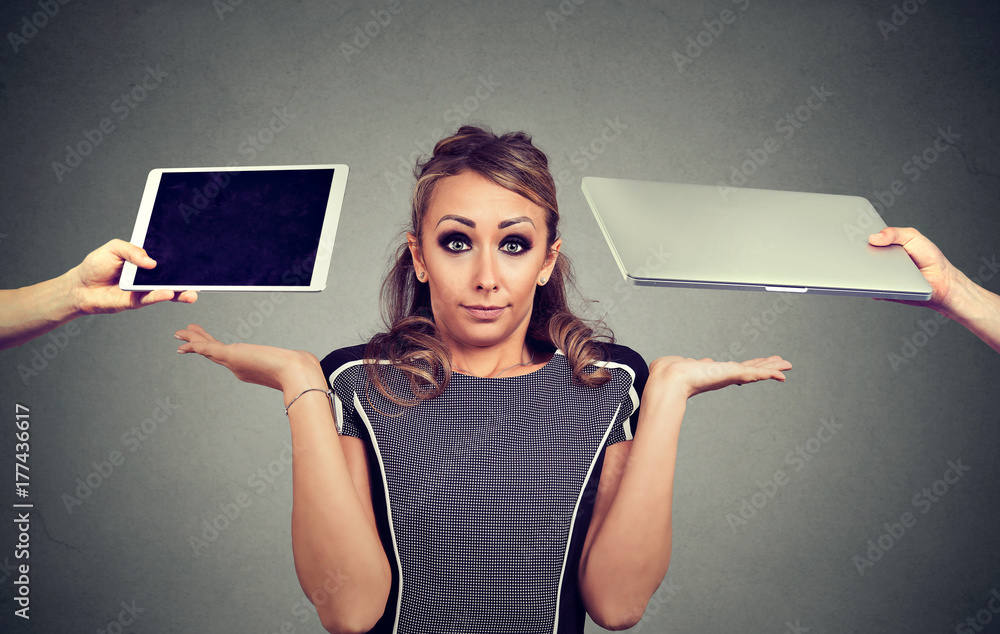 Perplexed young woman shrugging shoulders uncertain what to choose tablet or laptop computer