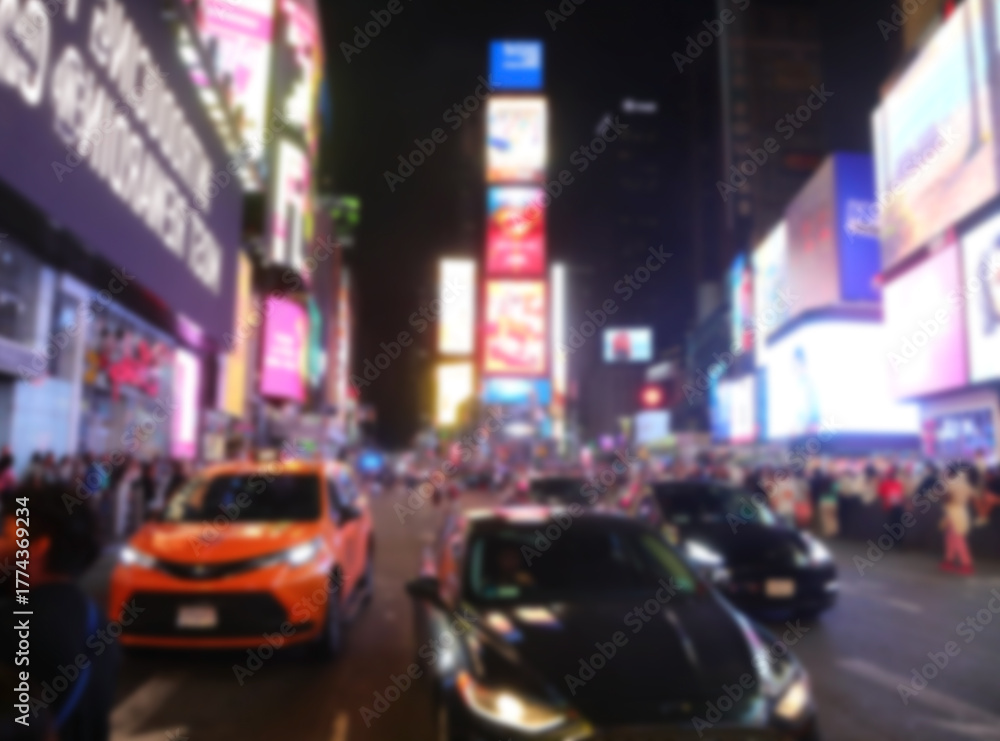 intentionally blurred image of times square at night with cars taxis bright advertising signs background