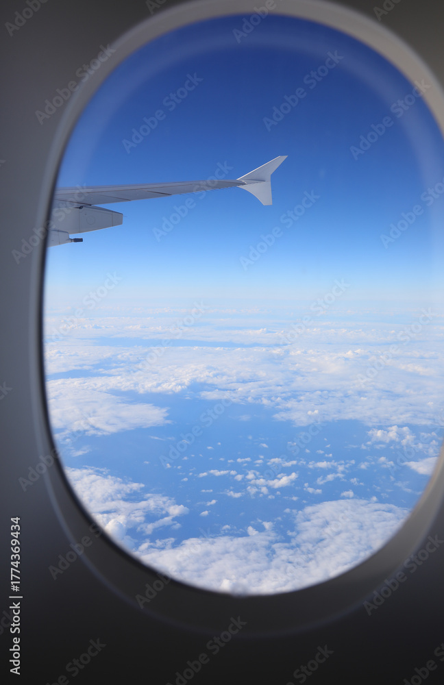 aerial view from oval porthole of passenger plane flying above clouds with wing section visible