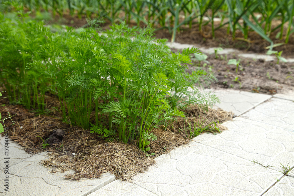 Carrots grow in the garden under mulch from dry grass. Organic farming in the country.