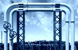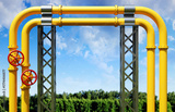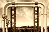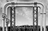 Pipeline against the cloudy sky. Fuel industry transportation line connection