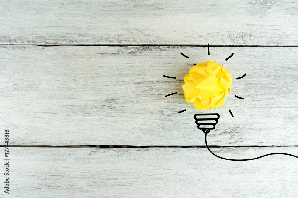 great idea concept with crumpled office paper and light bulb on white wooden table