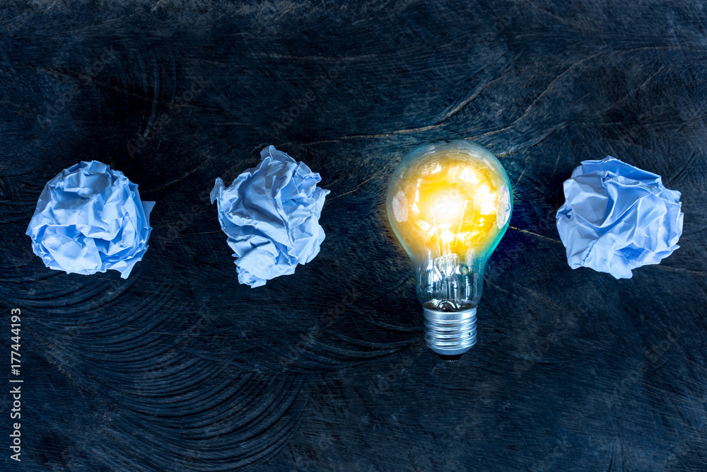 great idea concept with crumpled office paper and light bulb on table
