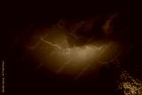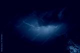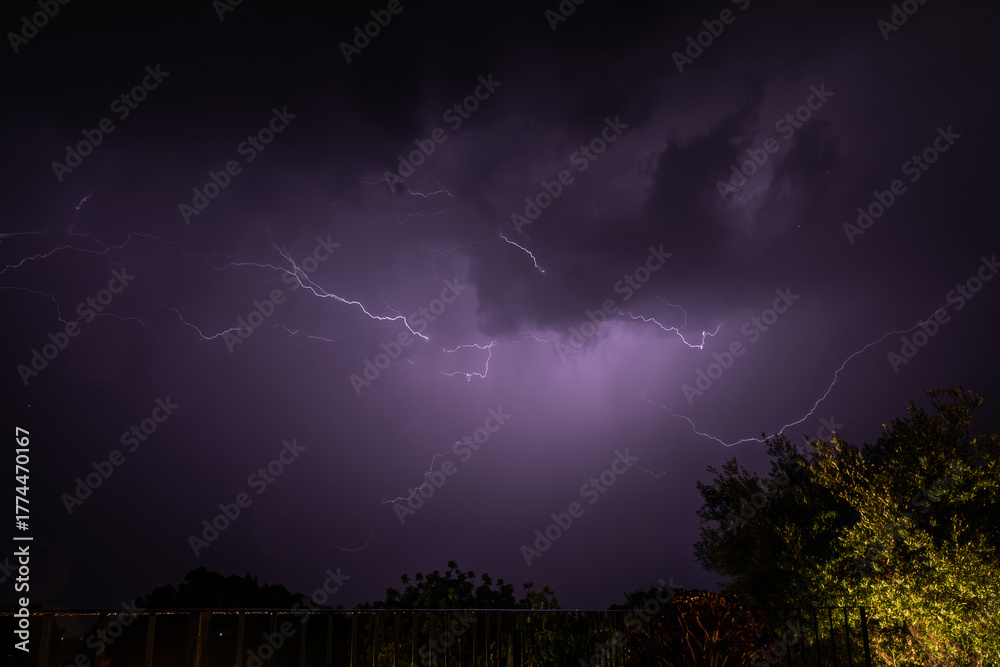 A dramatic lightning storm illuminates the night sky with bright purple flashes and dark storm clouds.