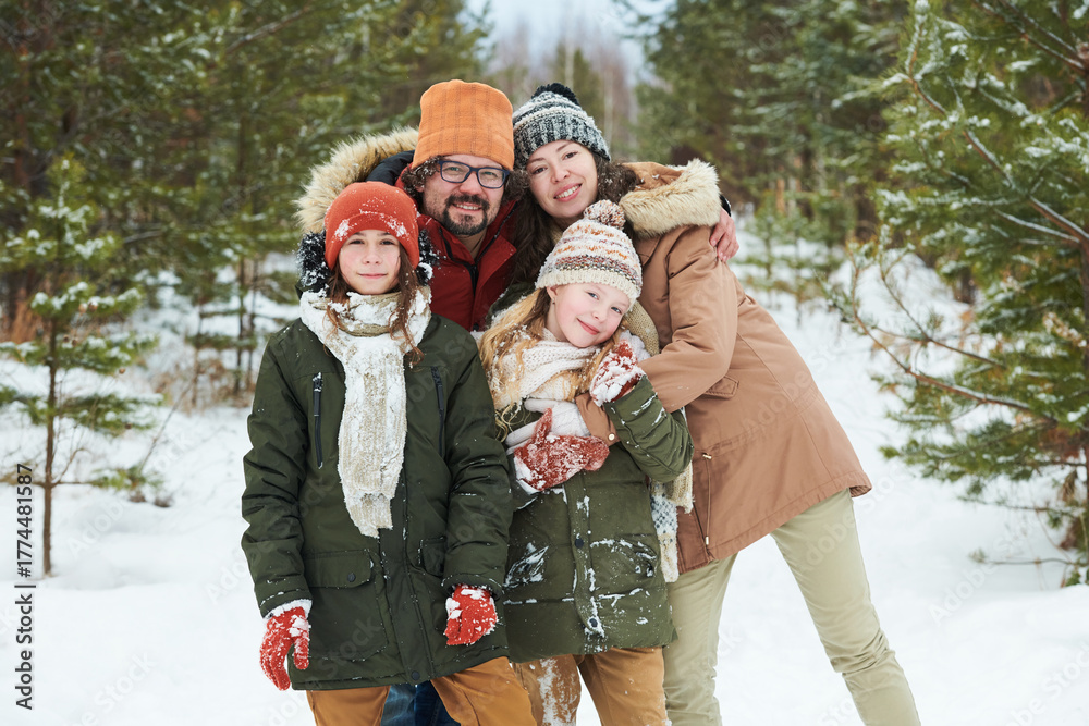 Caucasian couple embracing two Caucasian children outdoors, standing close together in snowy forest, all smiling and looking at camera during winter