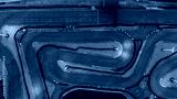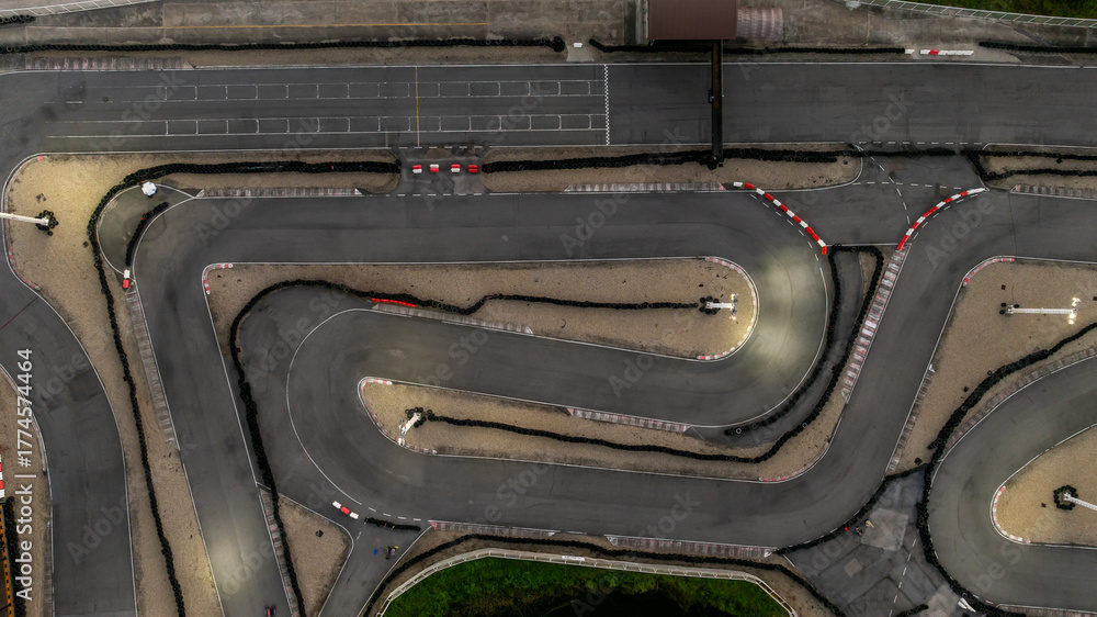 Aerial top view race kart track at night, Track for auto racing top view at night, Car race asphalt and curve street circuit, Aerial view asphalt race track at night.