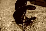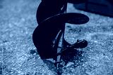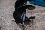 Wet black steel auger drill bit standing on wet ground after cleaning showing spiral blade detail and sharp tip used for soil drilling, ground excavation and foundation construction machinery