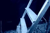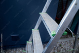 Aluminum step ladder with anti-slip treads and green edge protection placed outdoors on gravel ground used for maintenance, electrical installation and professional construction site work