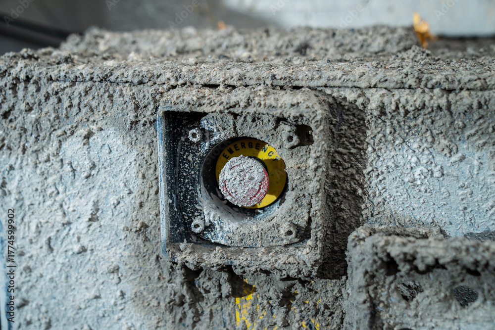 Dirty emergency stop control on industrial equipment covered with thick mud and concrete dust symbolizing construction site usage, safety mechanisms and rugged working conditions