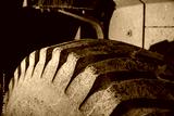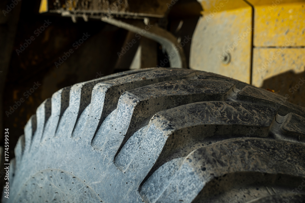 Close-up of large construction vehicle tire covered in dust and dried mud showing deep tread pattern, heavy equipment durability and industrial machinery used in excavation and groundwork