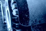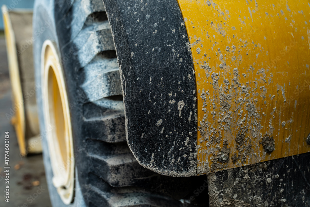 Heavy-duty construction wheel covered in mud and dust illustrating worksite endurance, traction strength, and mechanical power of loader or excavator used for roadwork and earthmoving projects