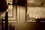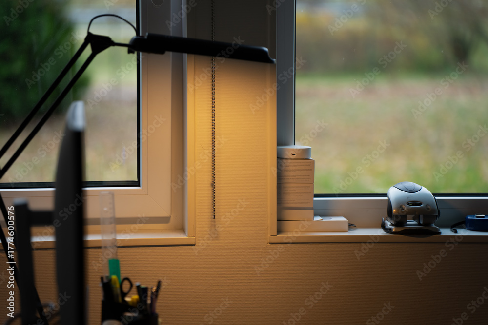 Minimal home office desk setup near window with modern lamp, pen holder, and computer screen showing workspace lighting arrangement, interior design balance, and productivity-oriented environment