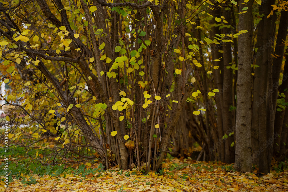 Dense group of trees with thin trunks and yellow autumn leaves with fallen foliage on the ground showing seasonal vegetation structure, natural color texture, and serene outdoor woodland environment
