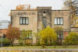 Aged apartment house with faded walls and yellow autumn leaves representing urban nostalgia, historic city neighborhood atmosphere, and seasonal harmony between architecture and nature
