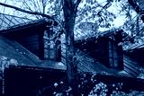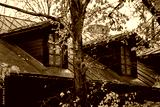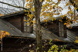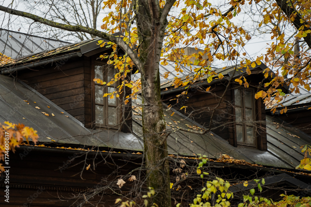 Old wooden house roof and attic windows surrounded by autumn trees with yellow leaves showing seasonal atmosphere, traditional architecture and harmony between natural foliage and historic building