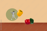 Pop zine 3d image collage of happy girl guy stand red yellow green pepper bulgarian paprika plate detox nutrition dinner vitamin