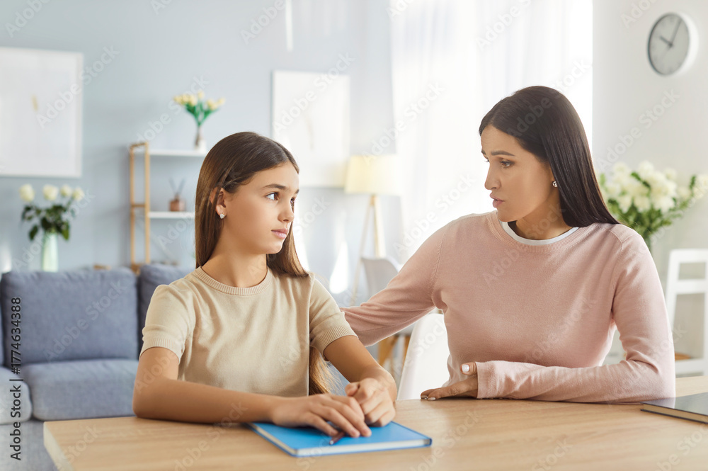 Loving and caring mother assisting teenage daughter with homework and engaging in a supportive conversation at home. Family support and help, education, and the importance of learning.