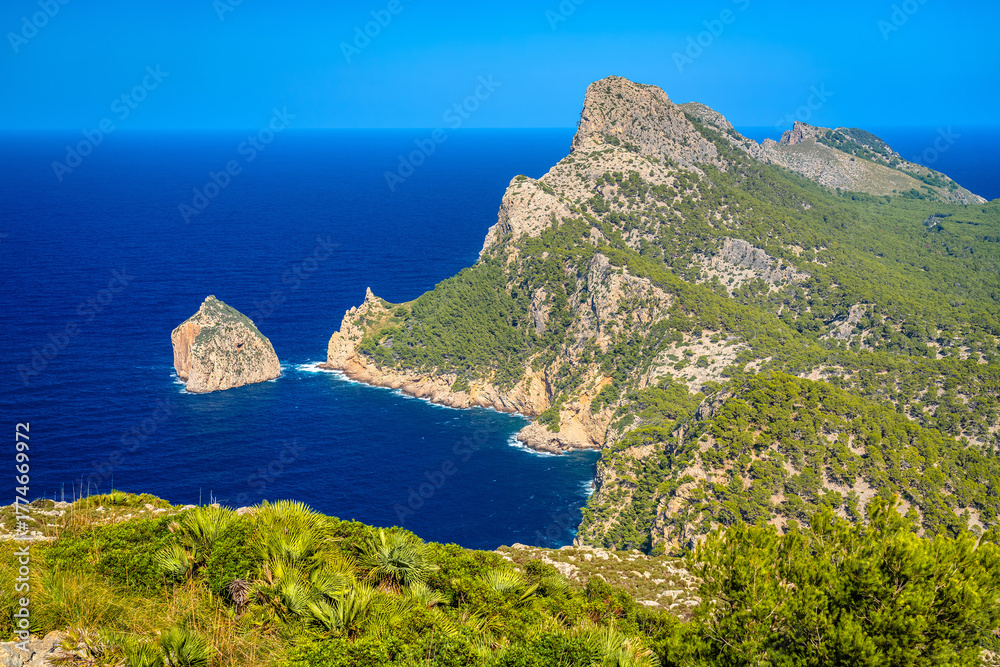 Island of Mallorca. Cap Formentor peninsula cliffs view from Albercutx Watchtower.