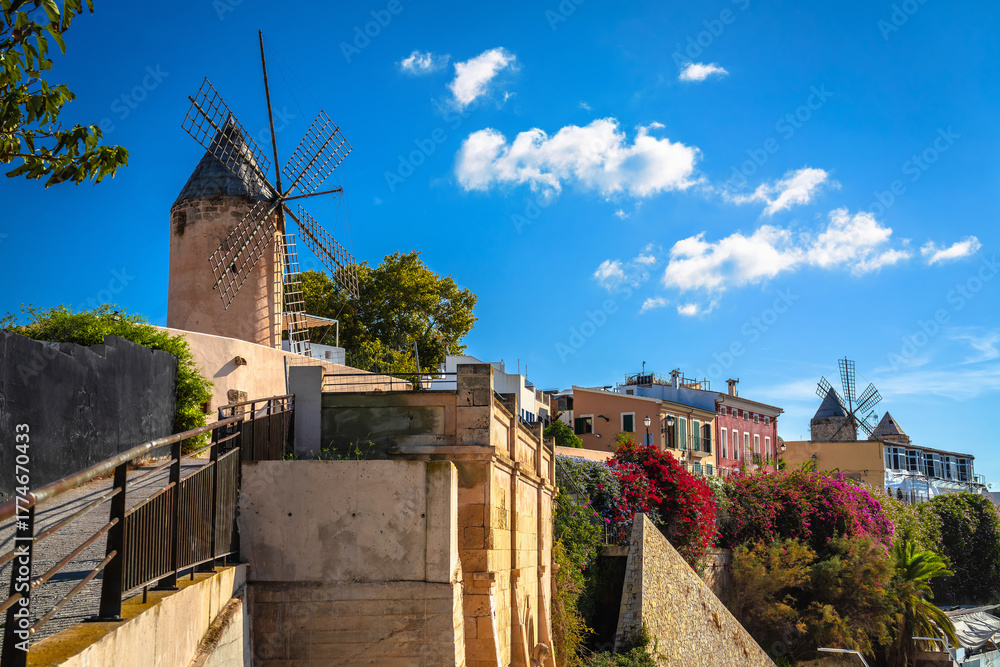 Island of Mallorca. Palma de Mallorca historic windmills and architecture colorful view