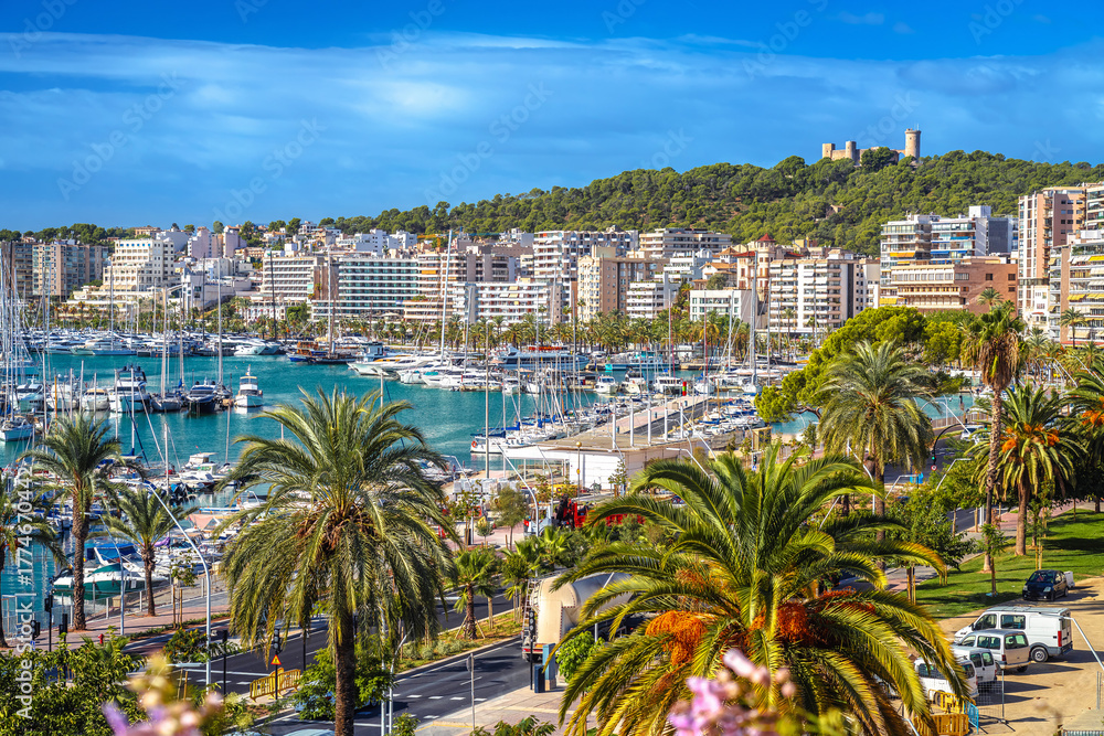 Island of Mallorca, Palma de Mallorca yachting harbor waterfront and waterfront architecture view