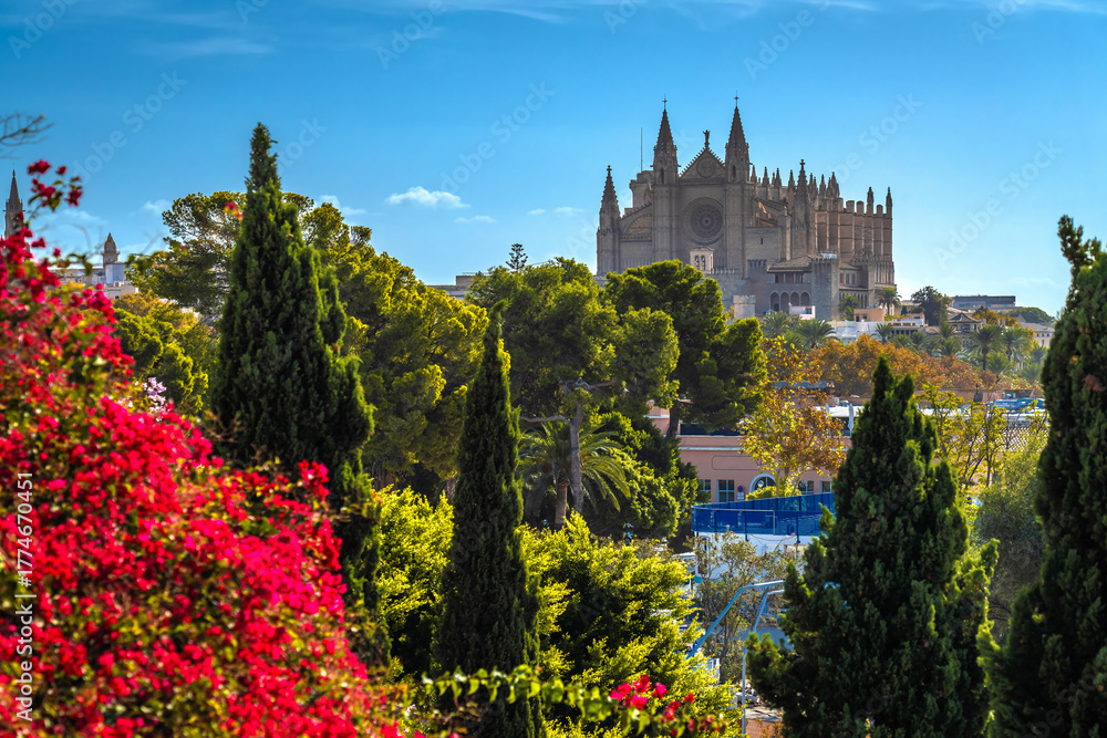 Island of Mallorca. Catedral Basilica de Santa Maria de Mallorca with nature frame view