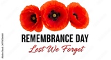 Three bright red remembrance poppies with text lest we forget for remembrance day