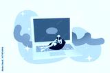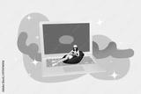 3d pop zine sketch artwork collage of happy girl sit beanbag laptop type message notification speech dialogue correspondence