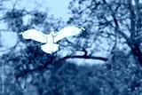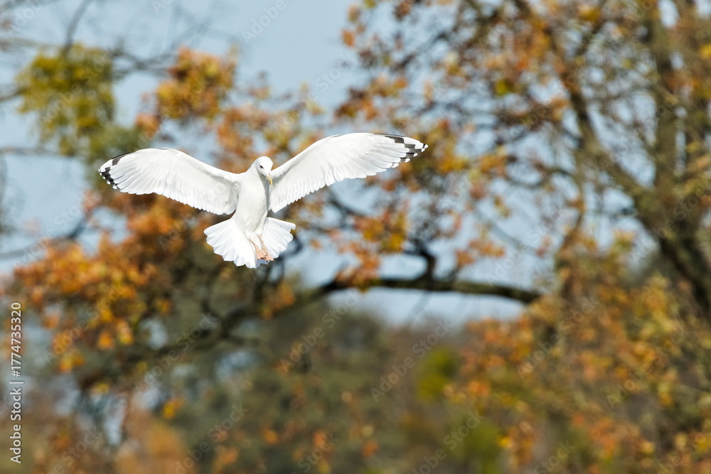Caspian Gull (Larus cachinnans) hovering above autumn forest – common species in the Czech Republic. Nice pose in flight.