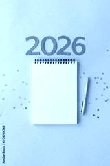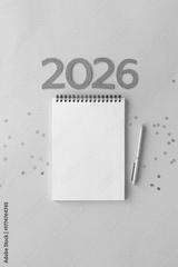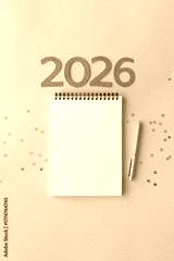 New Year 2026 planning concept with notebook and golden numbers for your goals, plans, resolutions. Flat lay style. Christmas planning concept with space for text