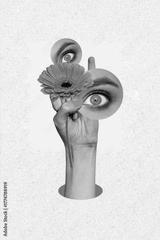 Creative vertical art sketch image collage of hands hold gerbera flower bloom bud eyeball inside spy stare observer imagination