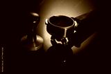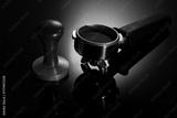 Espresso machine portafilter handle with compacted coffee and wooden tamper over gradient black background with reflection.