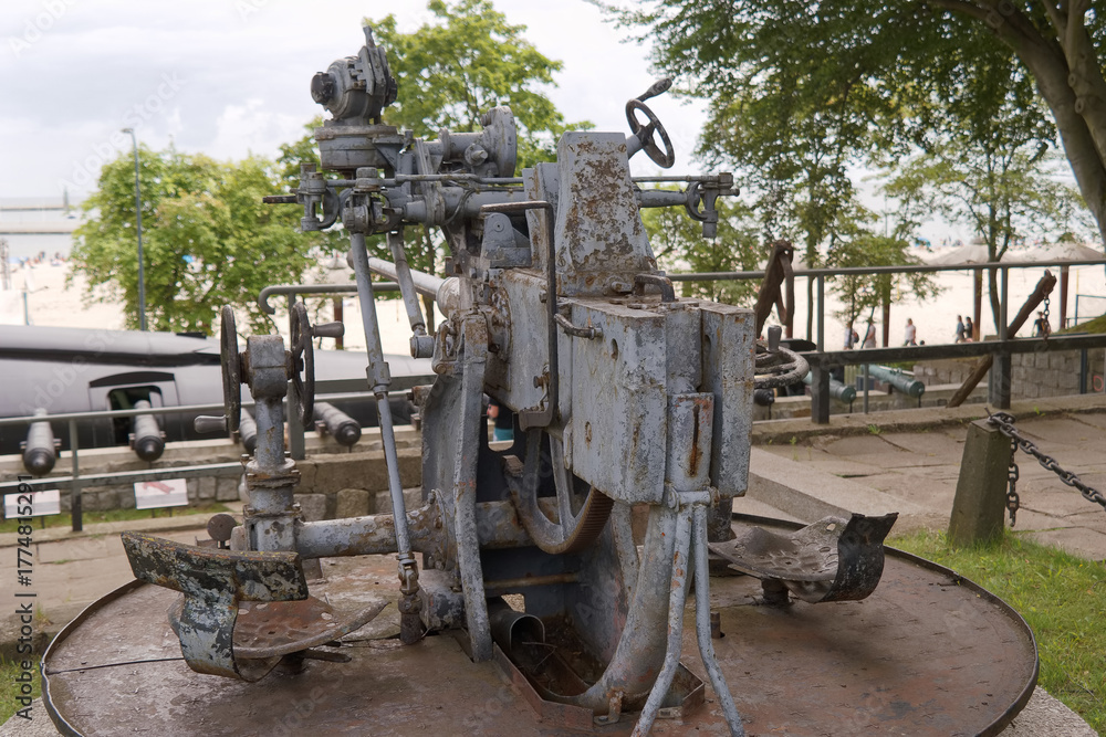 Rusty vintage machine displayed in an outdoor location near the beach on a sunny day