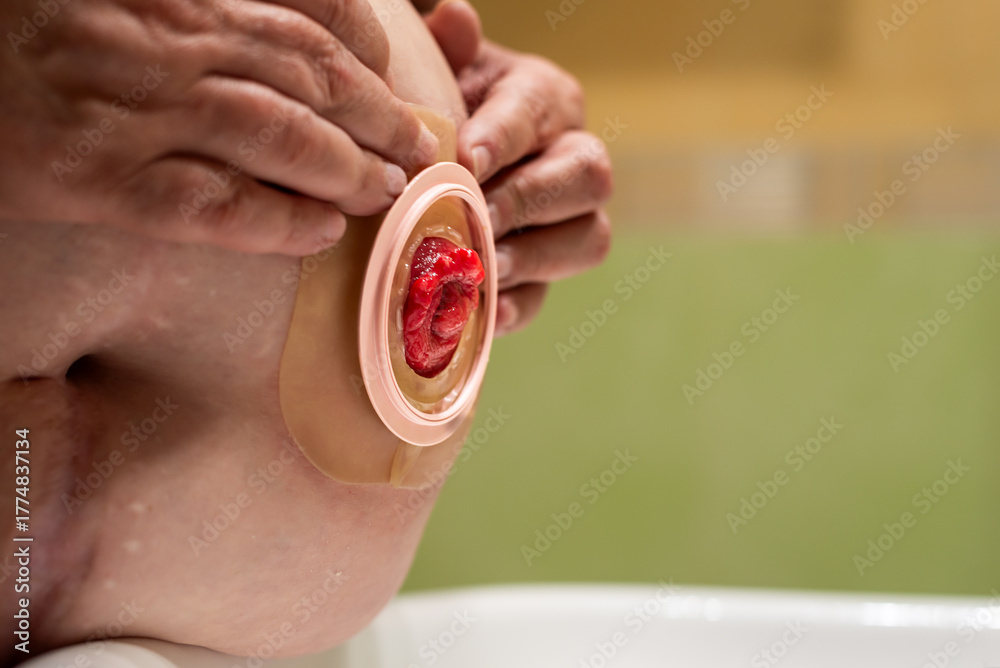 Close-up of female hands applying an ostomy base plate to a stoma at home