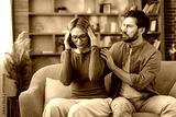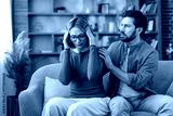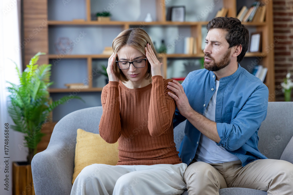 Woman clutching temples in severe headache while partner sits close on sofa offering comfort and support, tense couple coping with stress and emotional pain at home