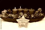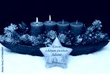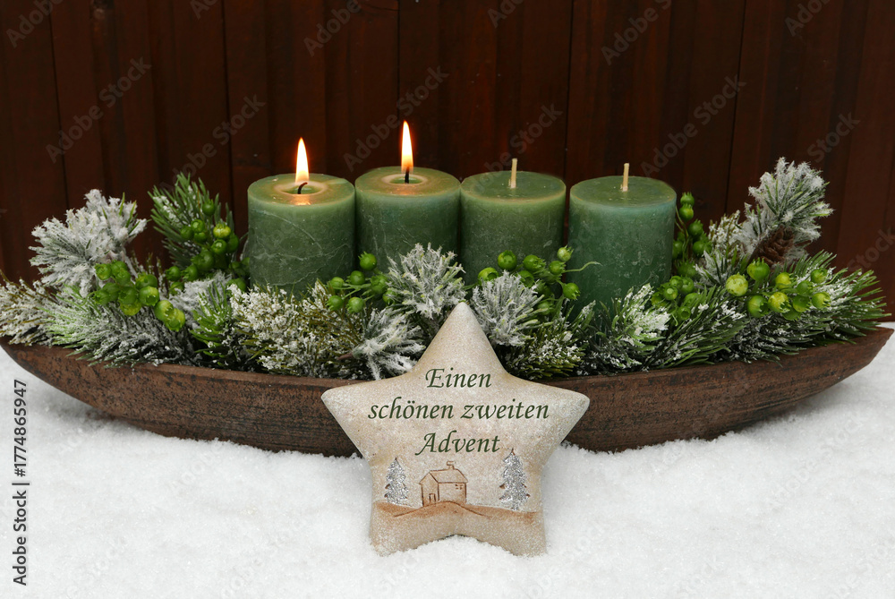 Zweiter Advent: Adventskranz mit grünen Kerzen und Adventsschmuck im Schnee.