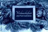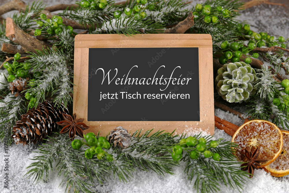 Weihnachtsreservierung: Kreidetafel mit der Beschriftung Weihnachtsfeier jetzt Tisch reservieren.