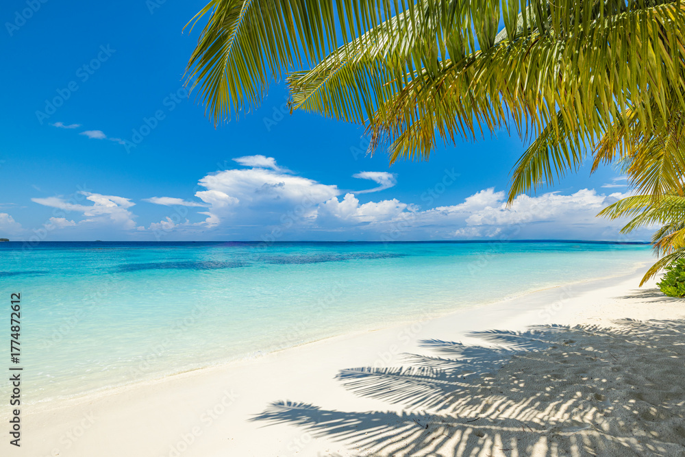 Tranquil tropical landscape. Relaxing paradise island beach sunlight blue sea sky palm leaves. White sand closeup on perfect summer vacation outdoors. Gorgeous nature view popular travel destination